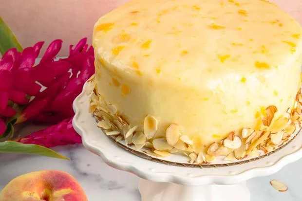 - Two layers of vanilla chiffon cake, filled and frosted with custard cream mixed with chopped peaches and topped with sliced almonds.